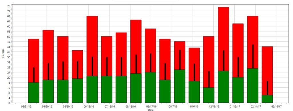 上のグラフには17本の棒が表示されています。一年間365日を牛の発情周期21日間で割ると17となります。よって、このグラフには1年間分の成績が表示されています。