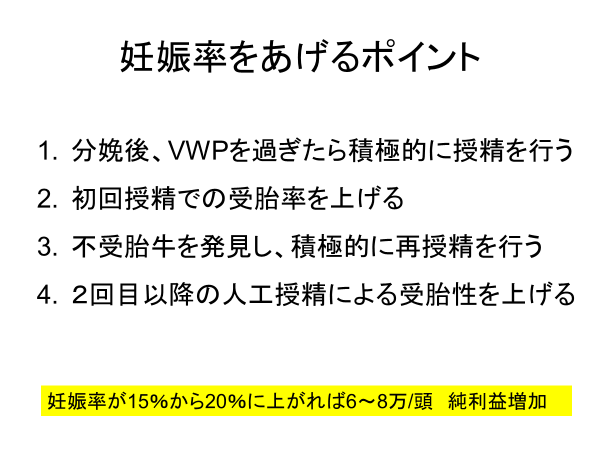 ホルスタイン種では妊娠率が15%から20%に5ポイント上昇すると単純計算で1頭あたりの純利益が6~8万円増えるとの試算もあります。