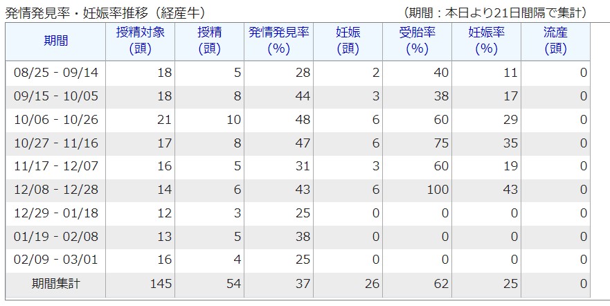 左の日付けは21日間隔で表示され、授精対象牛・授精頭数・発情発見率・妊娠頭数・妊娠率・流産頭数の順に表記されています。