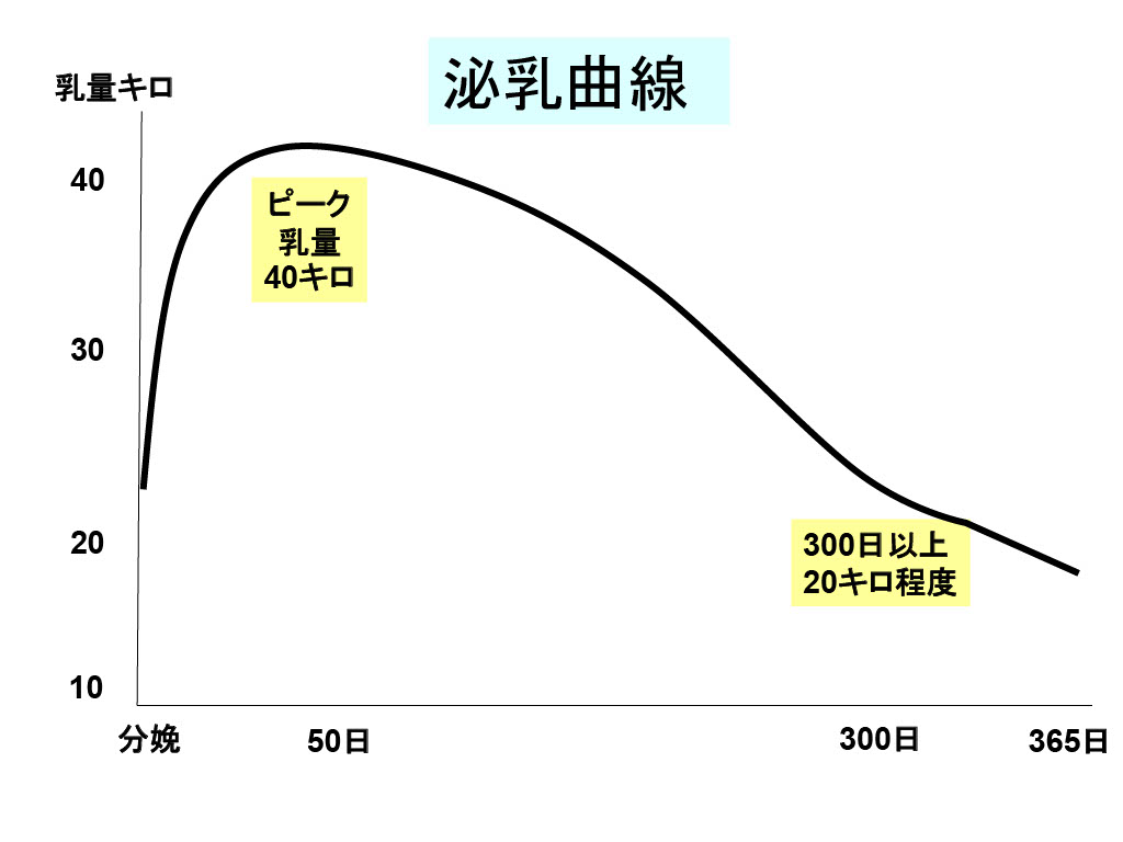 人間と同じように牛は出産することにって初めて泌乳を開始します。1日の泌乳量は分娩後1~2ヶ月でピークを迎えその後緩やかに減少していきます。搾乳を初めて300日程度したら搾乳を中止して、60日間ほど次の出産を迎える為に牛を休ませます(乾乳)。