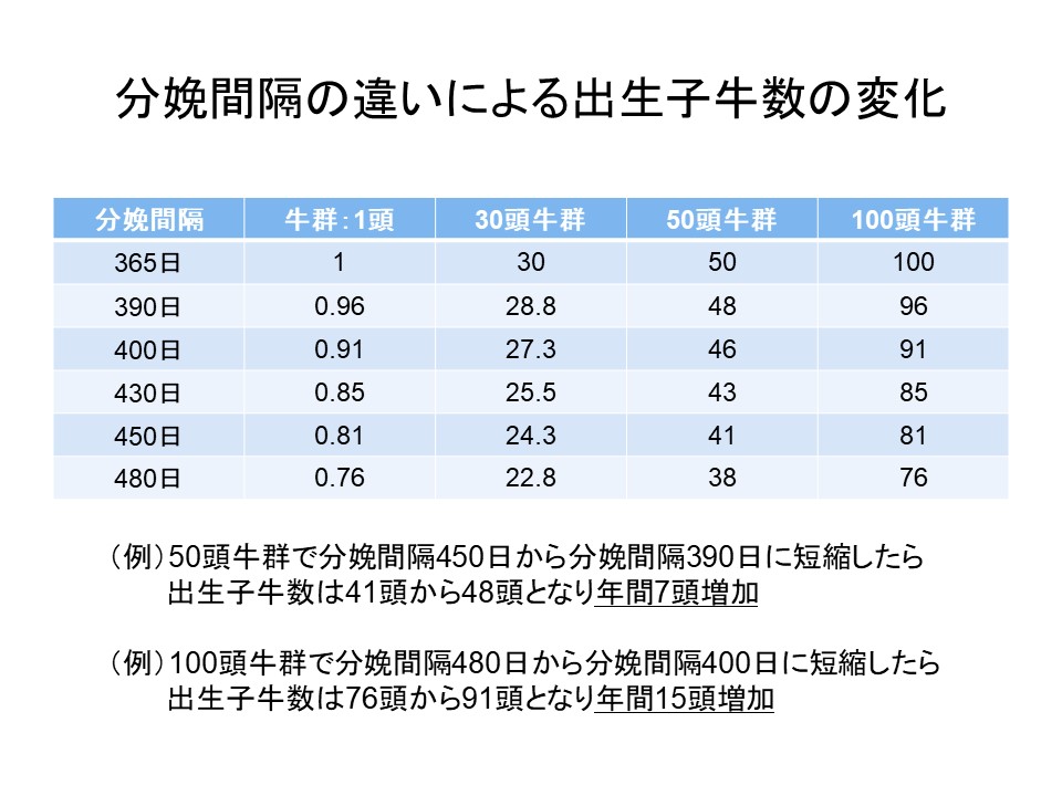 牛群の繁殖が回り始めると年間の出生子牛数が増加します。例えば50頭規模の牛群で分娩間隔が450日から390日に60日短縮すると年間7頭出生子牛数が増加します。たった7頭と思うかもしれませんが、和牛やF1子牛が生まれると年間100万円以上の利益になります。