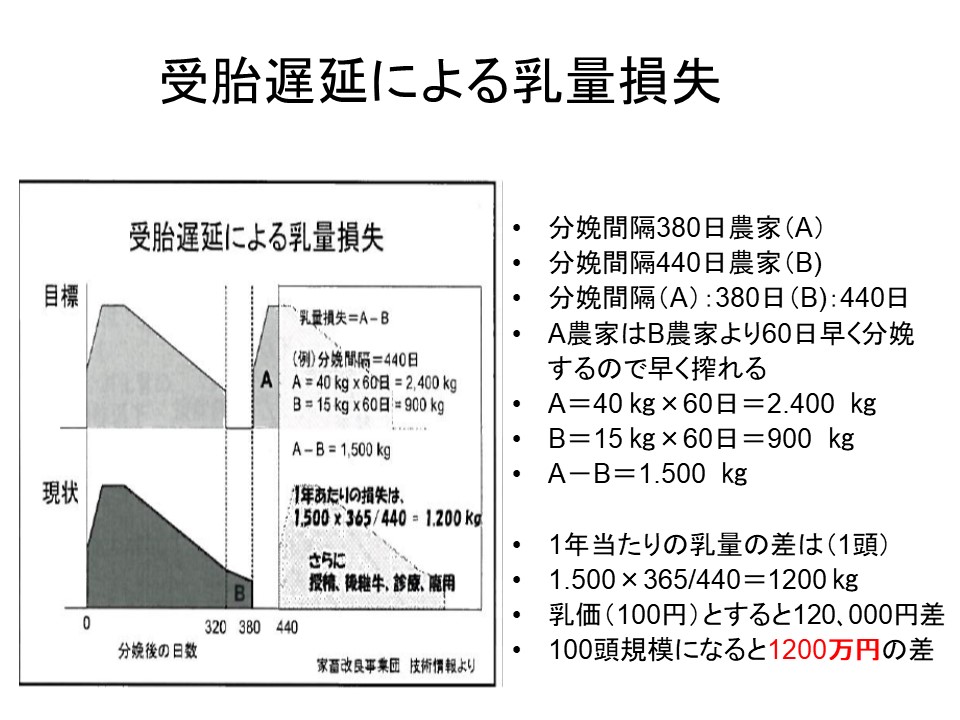 100頭規模の分娩間隔380日農家と分娩間隔440日農家で乳価100円と設定すると年間あたり1200万の差が発生する計算になります。