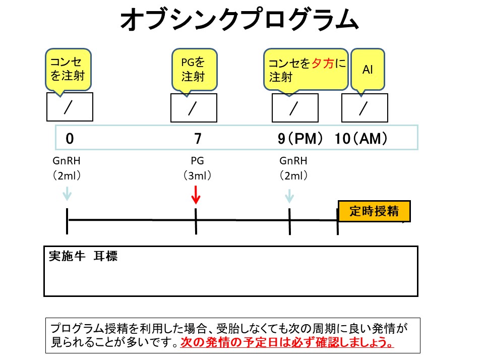オブシンク法は数あるプログラム授精の基本形であり、このプログラムをしっかり理解すれば他のプログラムがスムーズに理解できるようになります。1990年代にこのプログラムが開発されました。要は牛の発情をホルモン剤でコントロールして、決められたタイミングで授精します。