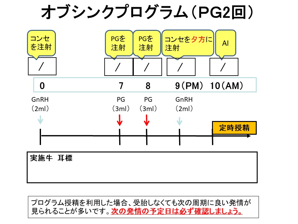 わたしの場合は繁殖検診をする際、なるべく早く授精するために状況に応じてオブシンク法とPG投与を使い分けていました。