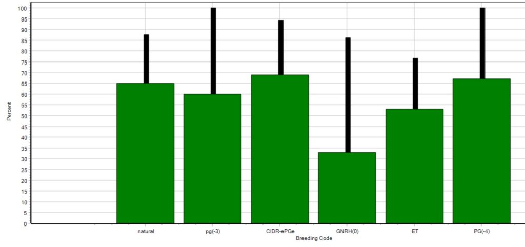 この図は、CIDRシンクが成功している農場の事例を示しています。左から3番目の棒がCIDRシンクの受胎率であり、受胎率は70%となっています。自然発情の受胎率が65%なので、優れた受胎率と言えます。