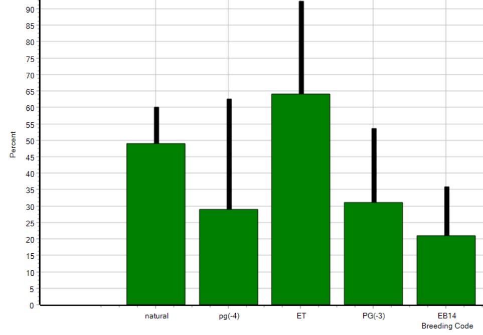 授精方法別の受胎率を示した図があります。一番右側のEB14は、CIDRを14日間留置した授精の受胎率を表しており、受胎率は20%しかありません。