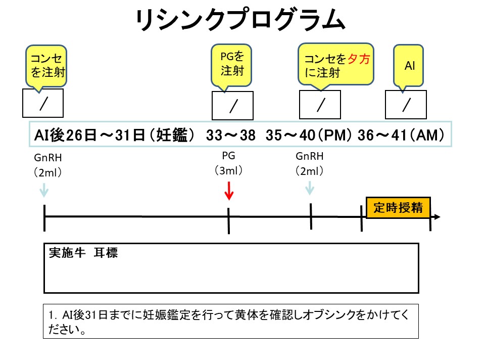 これらの発情を見つけにくい不受胎牛に対して、2回目・3回目の授精をいかに早く、そして高い受胎率を追求する為にリシンクプログラムという方法もあります。