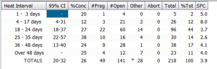 この表では18-24daysの割合割合が18%となっており、不受胎牛に対して18%(おおよそ5頭に1頭)しか授精できていないことを示しています。さらに不受胎牛に対して再授精するまで2サイクル以上(Over48days)の割合が40%もあります。これは、妊娠鑑定をして不受胎と診断し、授精するまでかなり時間を要していることを意味しています。