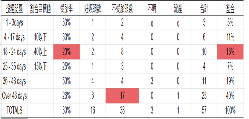 結果が全て!!!18-24Daysの授精割合を40%以上に、かつその受胎率を40%に!かつ、Over48Daysの割合を減らしましょう。