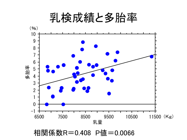 先ほどの農家で乳量と多胎率の関係性を見てみると、乳量が増えるにつれて多胎率が増えます。