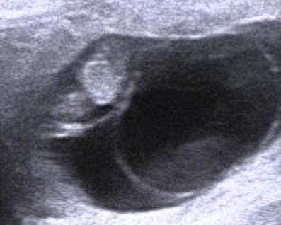 胎子の右側に見える輪がツインサークルです。双子の可能性が高いので反対側子宮を精査して下さい。