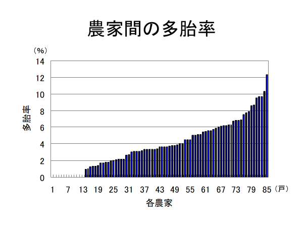 上のグラフを見て頂くと縦軸が多胎率(双子分娩率)、横軸が農家戸数です。0%の農家が10件程度で、10%近くある農場が5件程度あり、0%~15%の範囲に収まっています。