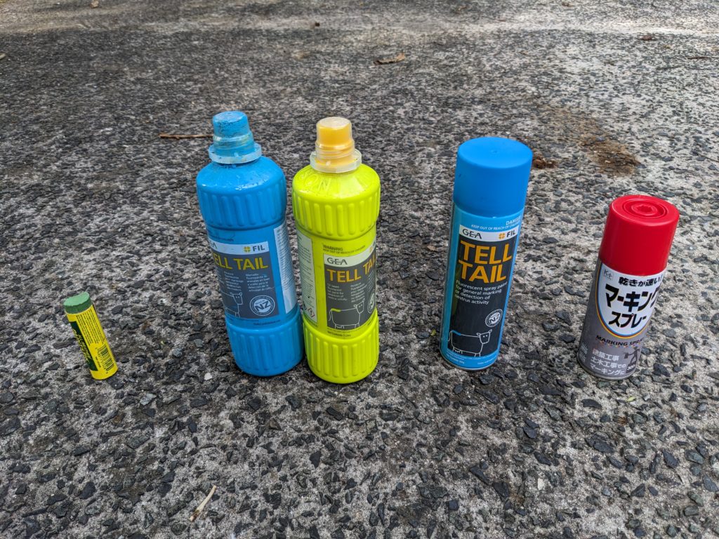 左からテイルチョーク:舎飼いで消えるまで5日程度、テイルペイント:消えるまで1ヶ月程度、テイルスプレー消えるまで2週間程度、マーキングスプレー(安価):消えるまで3日程度になります。
