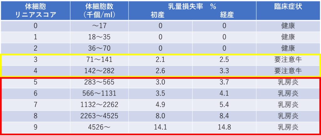 体細胞数が7万個/mlを超えると、要注意牛に分類され、乳房炎に罹患している可能性が高いと報告されています。この段階で乳量損失率は2%を超えてきます。