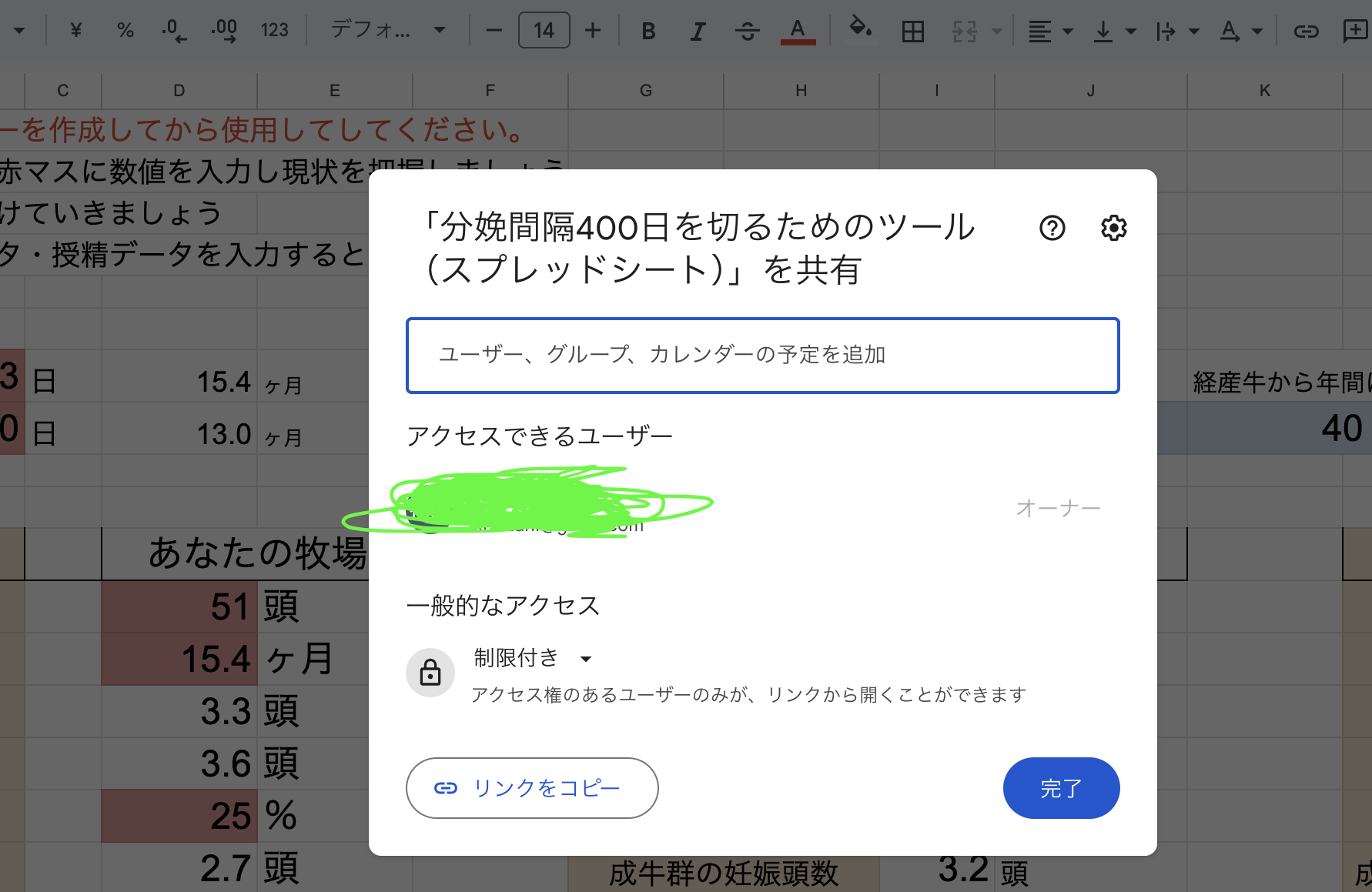 Googleが提供するスプレッドシートを活用すれば、獣医さんや授精師さんと簡単に牧場データを共有できます。