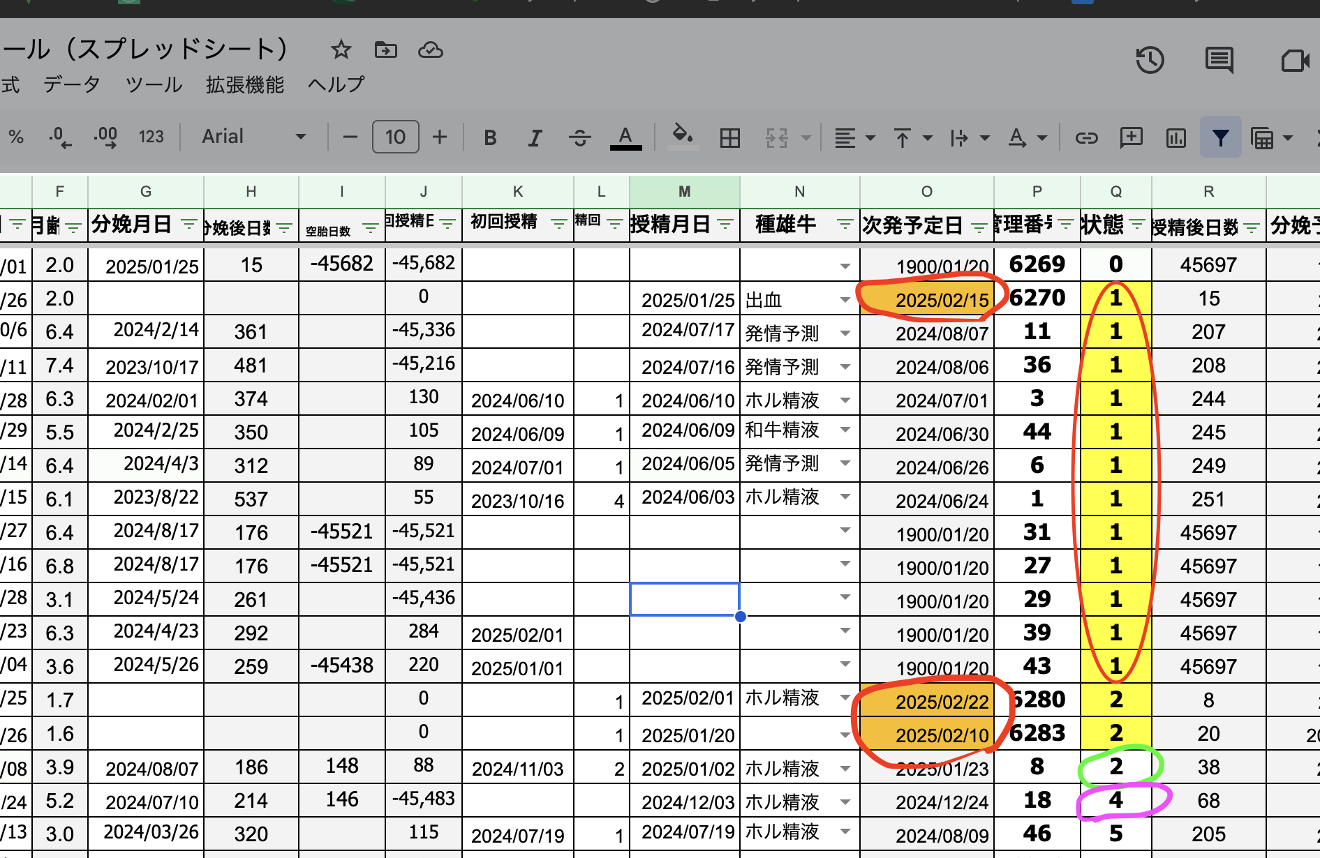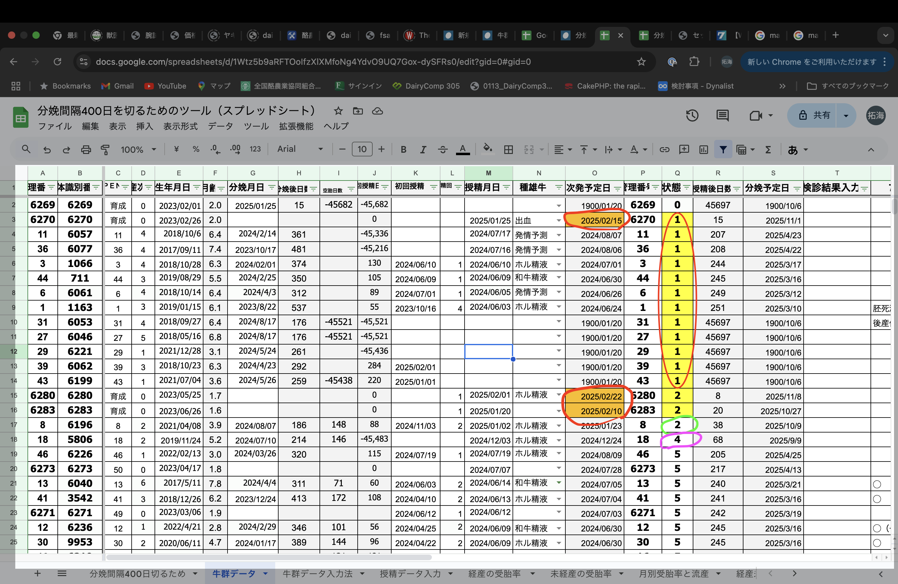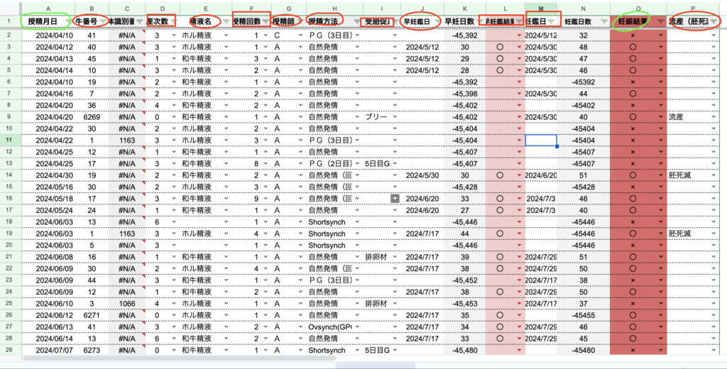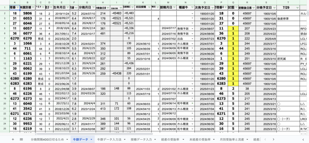 少々長くなりましたが、スプレッドシートの活用方法を解説しました。計算式が抜けている箇所もあるので調整してみてください(未経産の空胎日数など、)