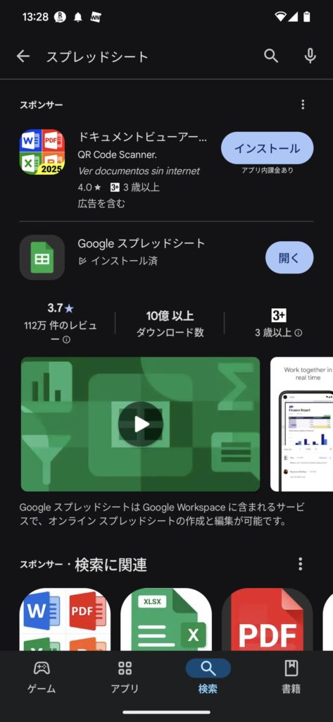 スマホで利用する場合は、アプリストアで 「スプレッドシート」 と検索し、アプリをダウンロードしてください。Google スプレッドシート→インストールです。