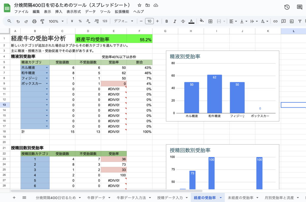 農場ごとに経産牛の特徴が異なり、それに伴い受胎率にも差が出ることが多いです。シートの一番上に、緑色で平均受胎率 を表示しています。