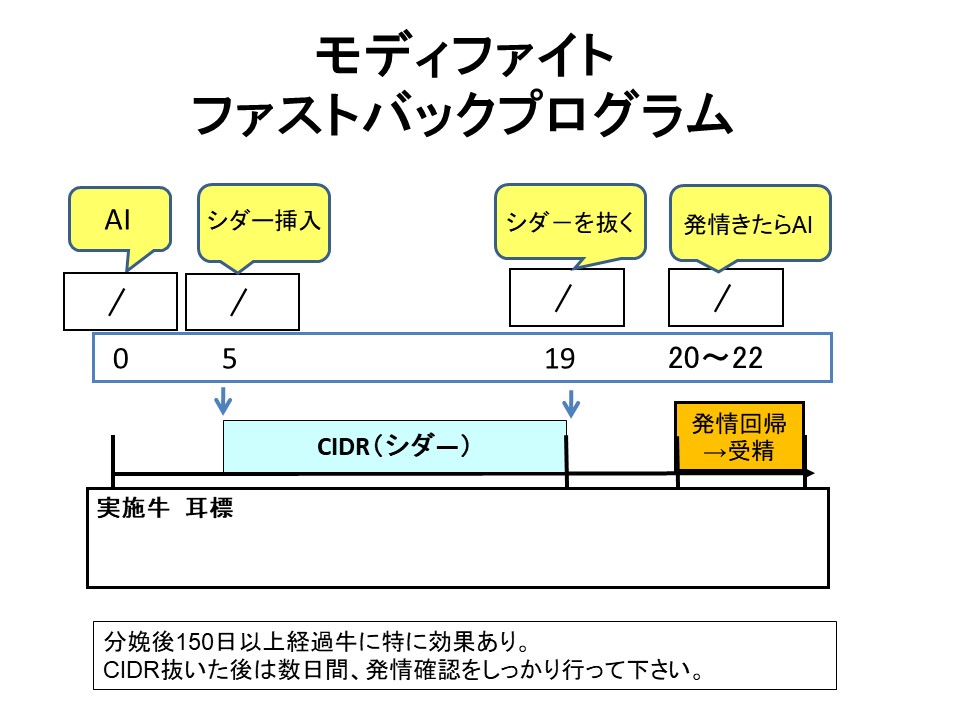 1.ファストバックプログラムは授精後5日目にシダーやイージーブリードを14日間留置する方法です。授精後5日目の黄体ホルモン濃度を受胎した牛と受胎したかった牛で比較した論文によると受胎した牛は5日目の受胎に有利に働く黄体ホルモンが有意に高いことが分かっています。シダーを留置することによって直接黄体ホルモン濃度を上げることができます。早期胚死滅の予防や胚発育促進等の効果があり、発情周期が明瞭に来る牛、太っている牛、分娩して150日以上たっている牛には特に有効だと思います。また不受胎ですと、シダーを抜いた後3日以内に高確率で発情行動を示しますので、回帰発情の発見にもつながります。是非、試してみてください。